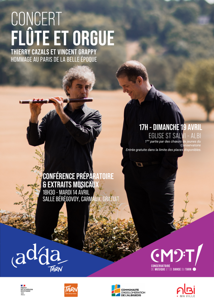 Professeur de flûte au Conservatoire depuis 2000, Thierry Cazals aborde tous les styles, de la musique ancienne jusqu’aux musiques contemporaines, en passant par le jazz. Pour ce concert, il invite son complice, Vincent Grappy avec qui il a enregistré en 2023 un album intitulé « D’un matin de printemps », un répertoire d’une infinie poésie, témoin heureux d’une époque impressionniste. Un hommage inspiré de Paris 1900, où l’alliance entre la flûte et l’orgue est naturelle, l’un n’est que mécanisation, l’autre amplification.